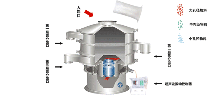 超聲波振蕩篩在直立式振動(dòng)電機(jī)與超聲波換能器的共同作用下,實(shí)現(xiàn)物料的篩分/分級目的。直立式振動(dòng)電機(jī)作為激振源,帶動(dòng)物料和篩網(wǎng)的振動(dòng)的同時(shí),超聲波換能裝置實(shí)現(xiàn)對物料靜電,易聚團(tuán)的抑制,保證物料的松散從而實(shí)現(xiàn)物料的篩分目的。